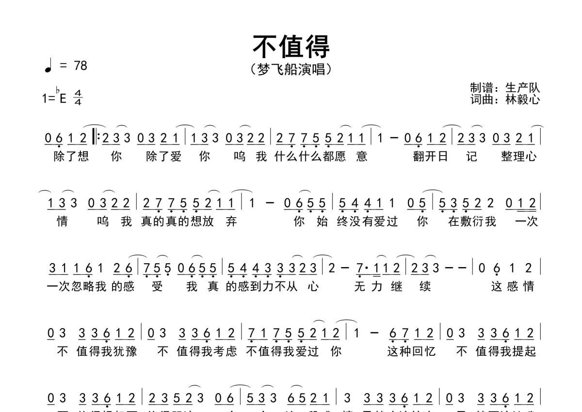 《不值得》是梦飞船演唱的一首歌曲,原版简谱,拍号为4/4拍,歌曲速度为每分钟78拍,这份简谱共有一张高清图谱,图谱由 @生产队 编配上传梦飞船演唱的经典歌曲《不值得》原版简谱,精编完美版,优质推荐!。