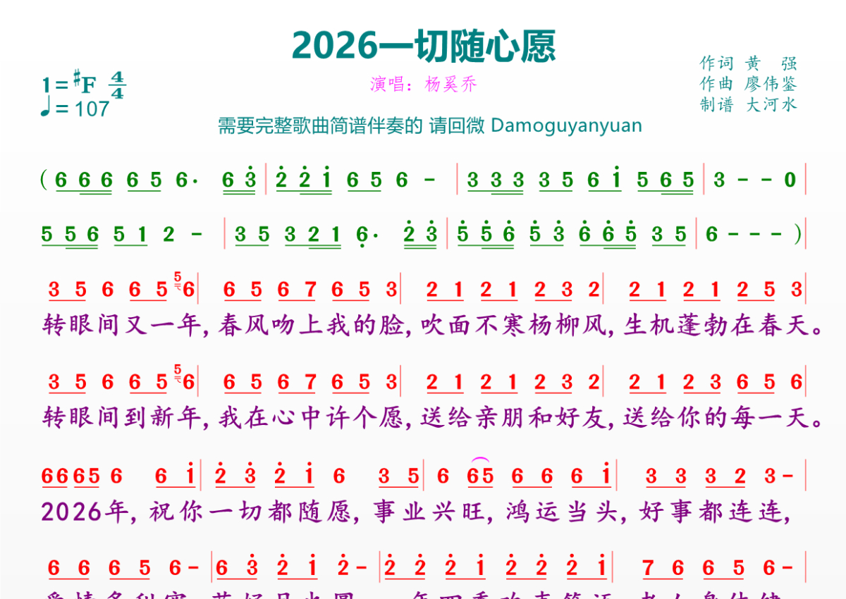 《2026一场随心愿》是杨奚乔演唱的一首歌曲,拍号为4/4拍,歌曲速度为每分钟107拍,这份简谱共有一张高清图谱,图谱由 @临海雪原 编配上传。