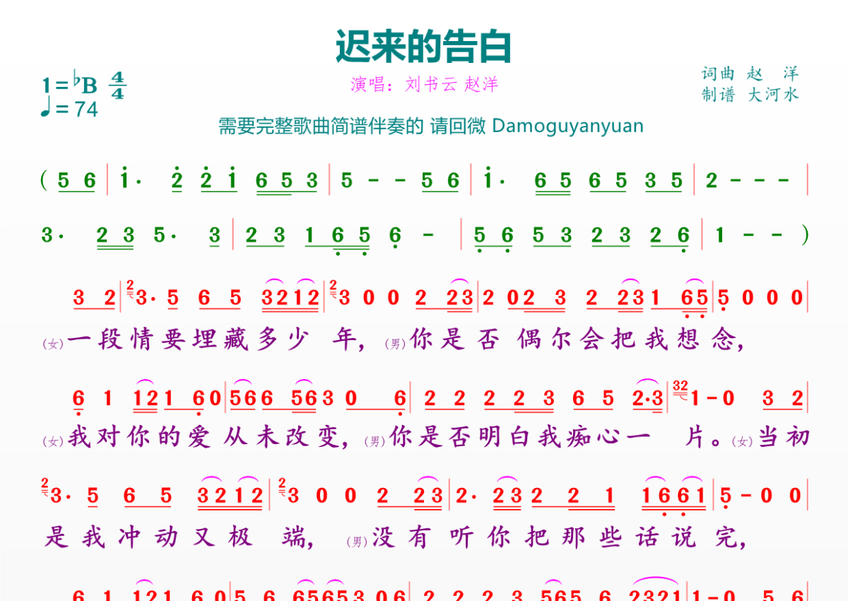 《迟来的告白》是刘书云 赵洋演唱的一首歌曲,拍号为4/4拍,歌曲速度为每分钟74拍,这份简谱共有一张高清图谱,图谱由 @临海雪原 编配上传。