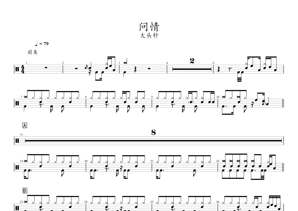 《问情》是大头针演唱的一首歌曲,拍号为4/4拍,歌曲速度为每分钟79拍,这份架子鼓谱共有两张高清图谱,图谱由 @音符喷血者 编配上传,图谱使用五线谱编配,使用这份问情架子鼓谱,你将能够轻松地敲打出这首大头针的问情,快来尝试吧。