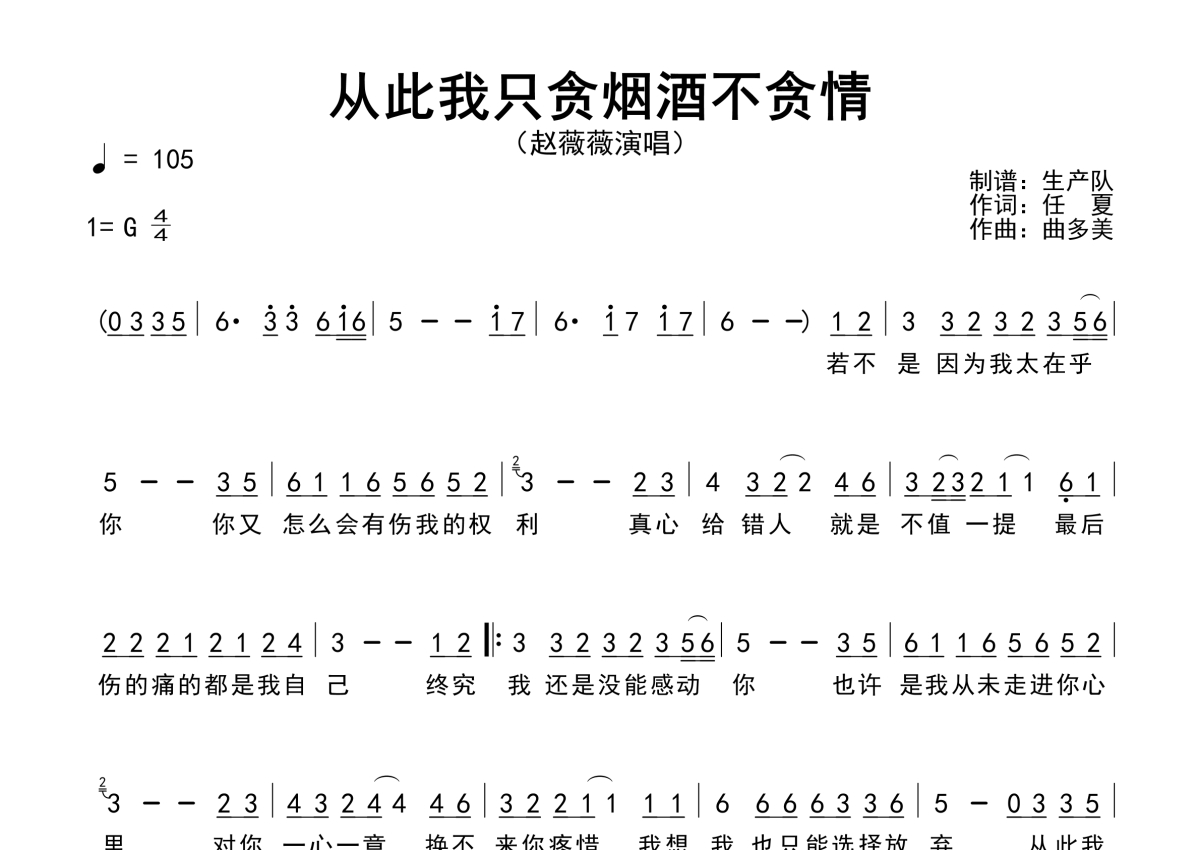 《从此我只贪烟酒不贪情》是赵薇薇演唱的一首歌曲,原版简谱,拍号为4/4拍,歌曲速度为每分钟105拍,这份简谱共有一张高清图谱,图谱由 @生产队 编配上传赵薇薇演唱的歌曲《从此我只贪烟酒不贪情》原版简谱,含精准的前奏、间奏、尾奏solo编配,精编完美版,优质推荐!。