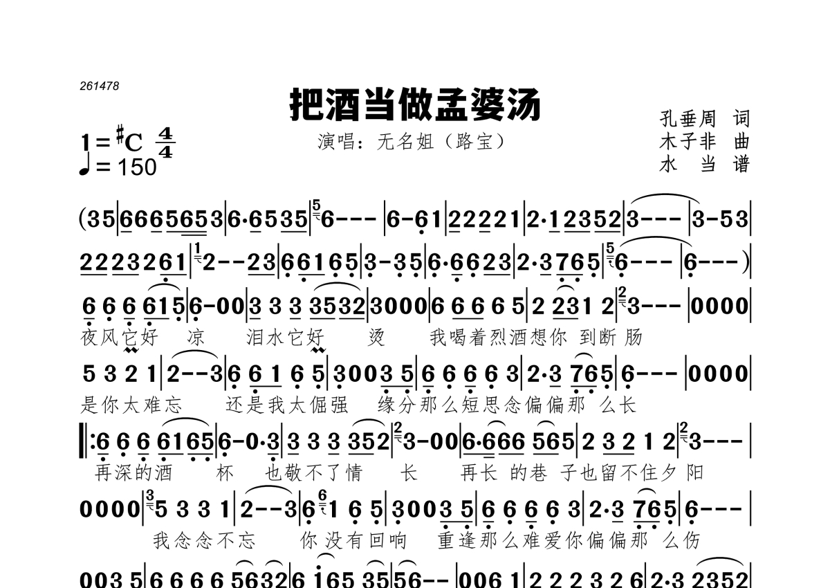 《把酒当做孟婆汤》是无名姐(路宝)演唱的一首歌曲,拍号为4/4拍,歌曲速度为每分钟150拍,这份简谱共有一张高清图谱,图谱由 @水当 编配上传。