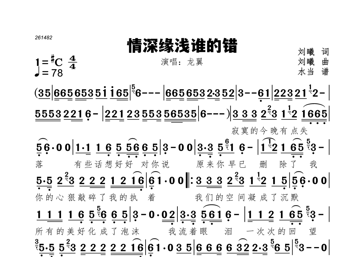 《情深缘浅谁的错》是龙翼演唱的一首歌曲,拍号为4/4拍,歌曲速度为每分钟78拍,这份简谱共有一张高清图谱,图谱由 @水当 编配上传。