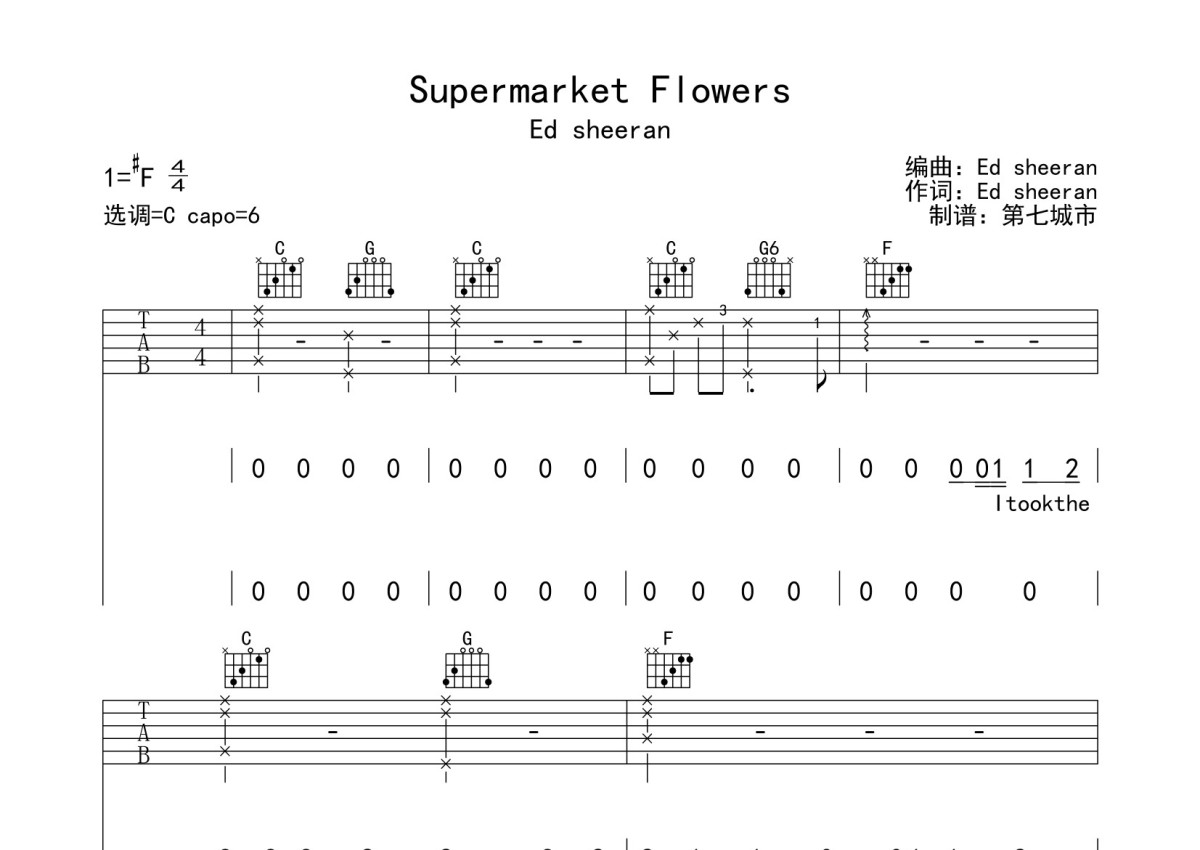 Ed sheeran《Supermarket Flowers》吉他谱 - C调弹唱六线谱