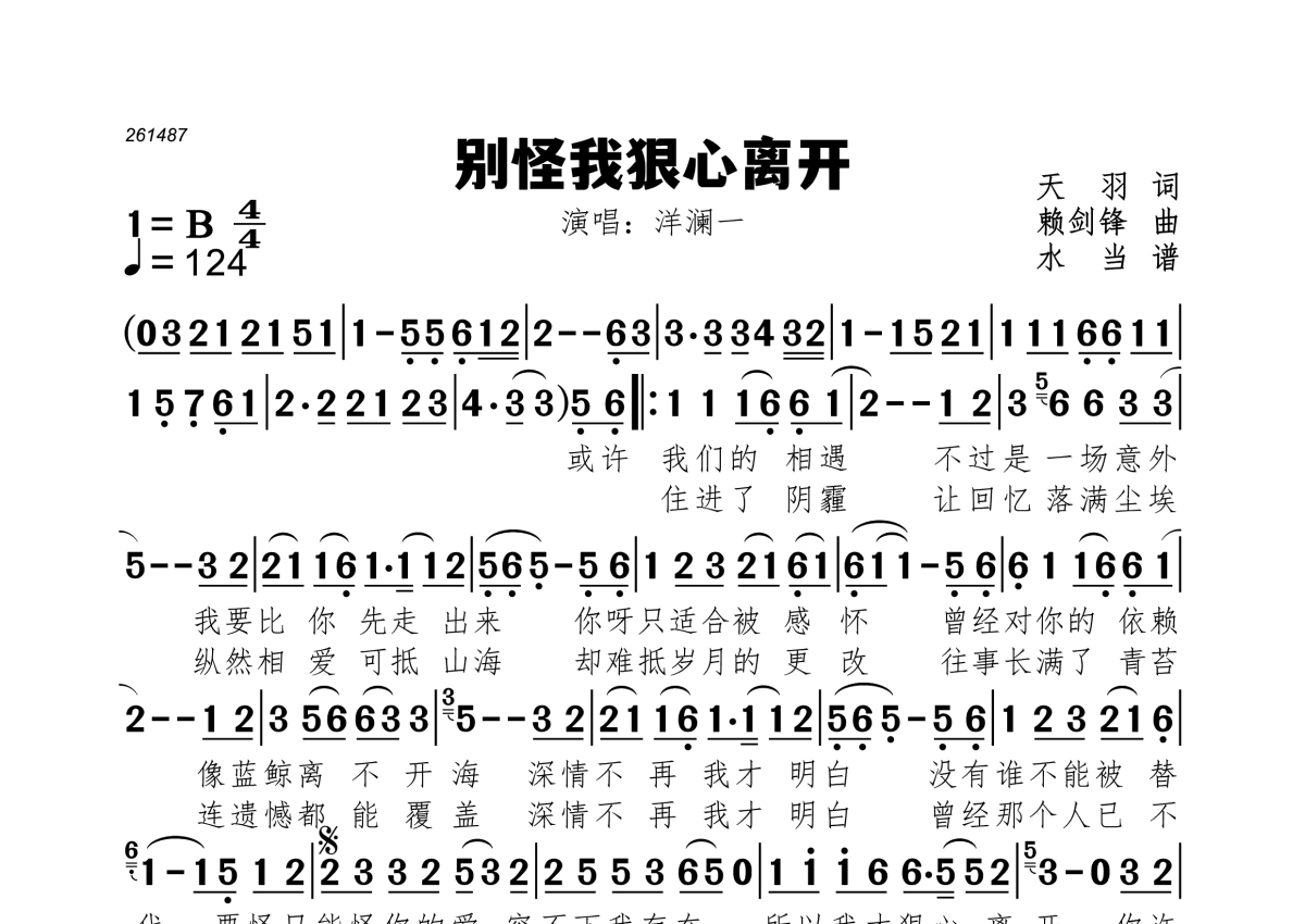 《别怪我狠心离开》是洋澜一演唱的一首歌曲,拍号为4/4拍,歌曲速度为每分钟124拍,这份简谱共有一张高清图谱,图谱由 @水当 编配上传。