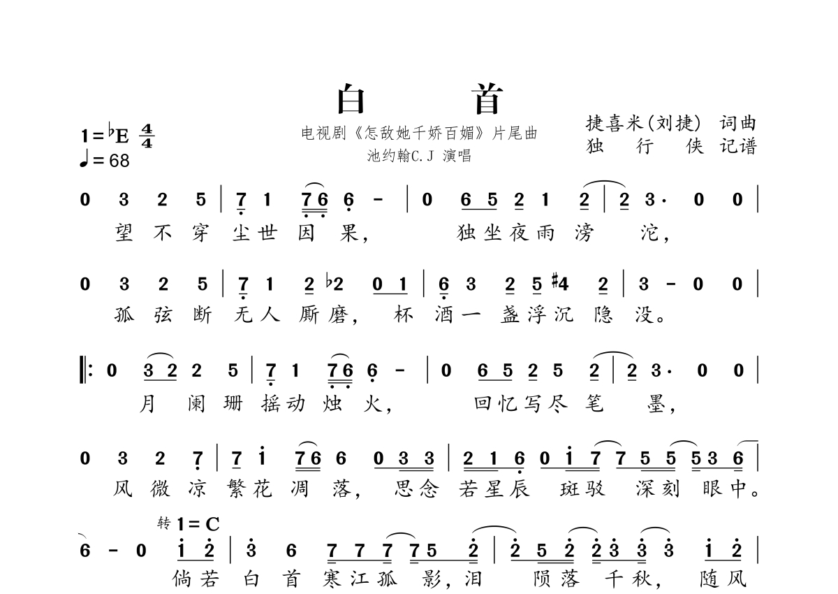 《白首》是池约翰C.J演唱的一首歌曲,拍号为4/4拍,歌曲速度为每分钟68拍,这份简谱共有一张高清图谱,图谱由 @独行侠 编配上传。