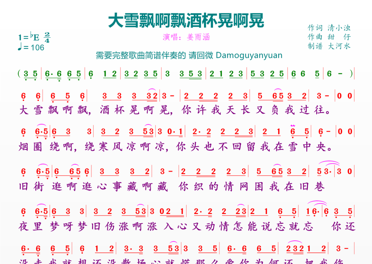 《大雪飘啊飘酒杯晃啊晃》是姜雨涵演唱的一首歌曲,拍号为2/4拍,歌曲速度为每分钟106拍,这份简谱共有一张高清图谱,图谱由 @临海雪原 编配上传。
