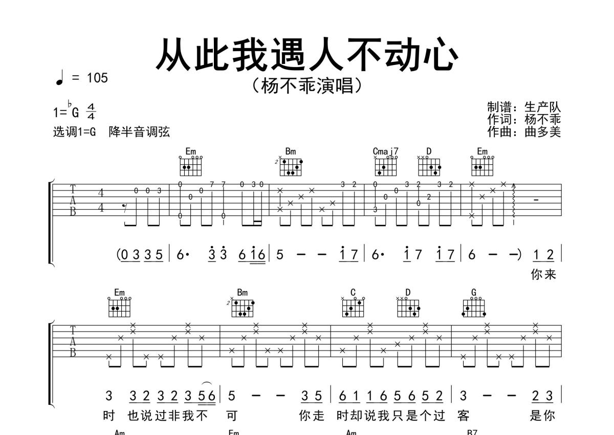 《从此我遇人不动心》是杨不乖演唱的一首歌曲,精编完美版,本吉他谱采用的是G调指法编配,这份吉他谱共有两张高清图谱,图谱由 @生产队 编配上传,图谱使用六线谱编配,包含吉他和弦指法、简谱以及歌词部分,使用这份从此我遇人不动心吉他谱,可以让你更加方便地掌握这首歌曲的弹唱技巧,快来尝试吧。杨不乖演唱的歌曲《从此我遇人不动心》原版吉他谱,含精准的前奏、间奏、尾奏solo编配,精编完美版,优质推荐!。