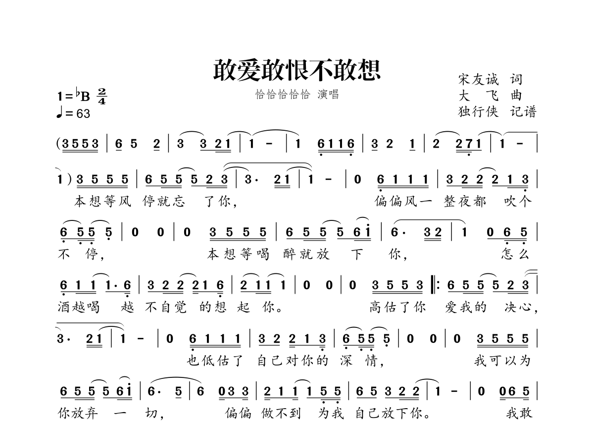 《敢爱敢恨不敢想》是恰恰恰恰恰演唱的一首歌曲,拍号为2/4拍,歌曲速度为每分钟63拍,这份简谱共有一张高清图谱,图谱由 @独行侠 编配上传。
