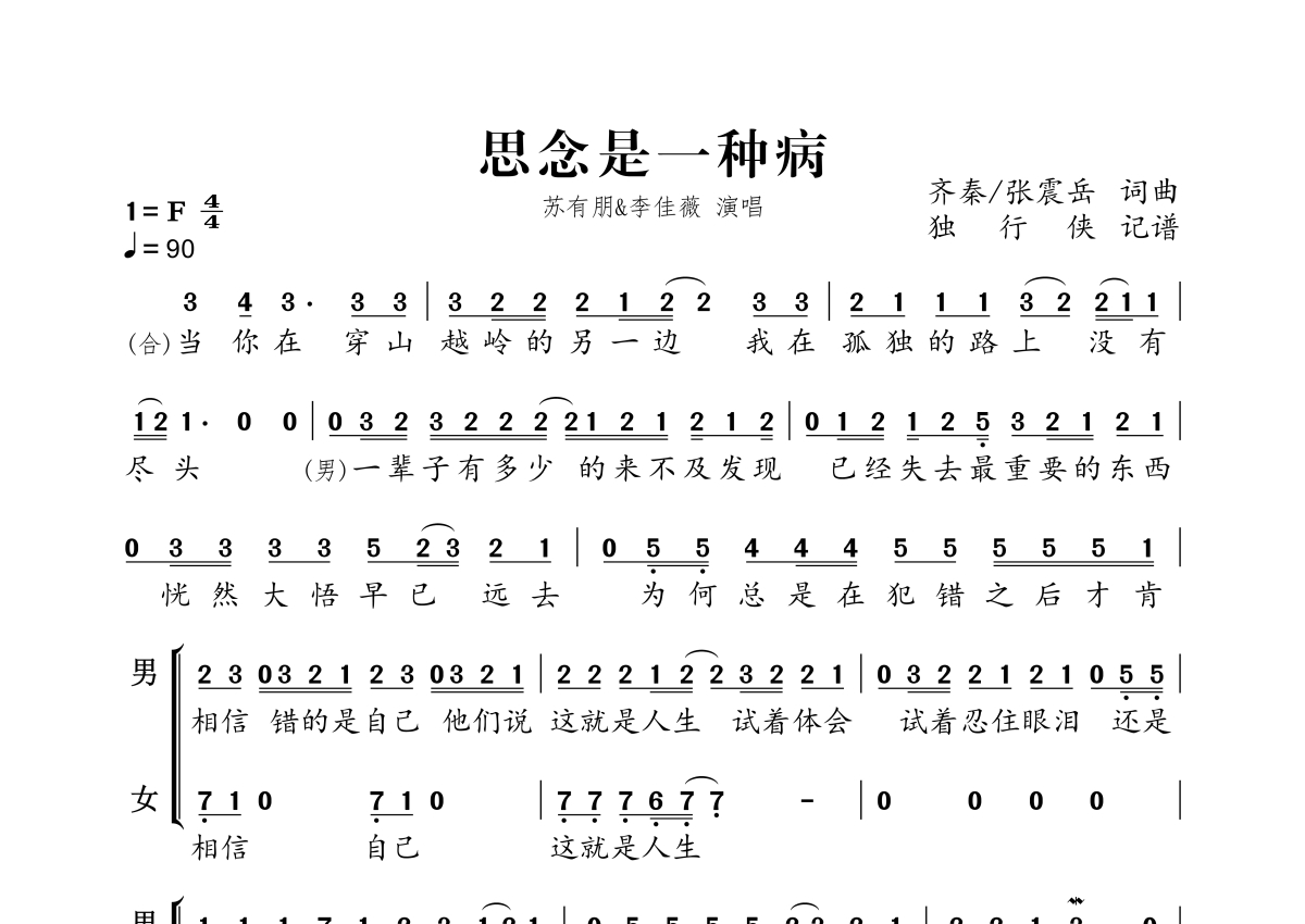 《思念是一种病(对唱版)》是苏有朋、李佳薇演唱的一首歌曲,拍号为4/4拍,歌曲速度为每分钟90拍,这份简谱共有四张高清图谱,图谱由 @独行侠 编配上传。