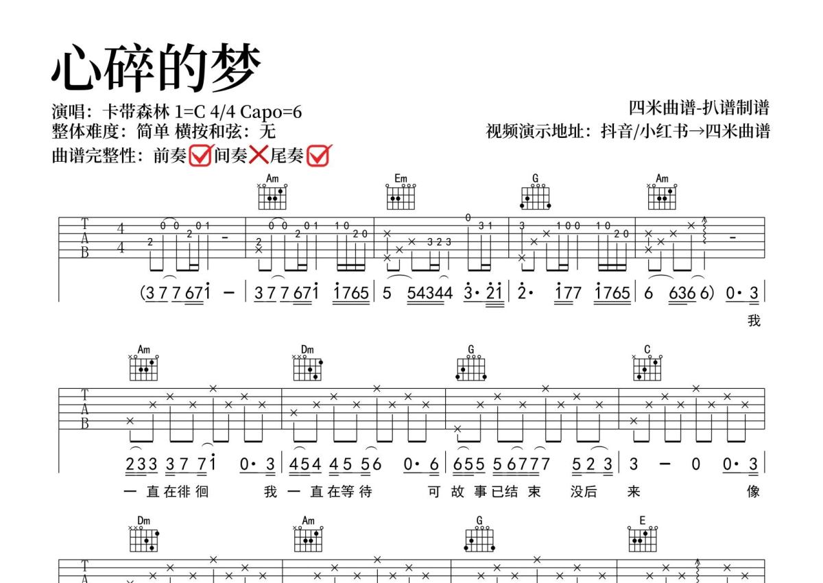 卡带森林《心碎的梦》吉他谱 - C调弹唱六线谱