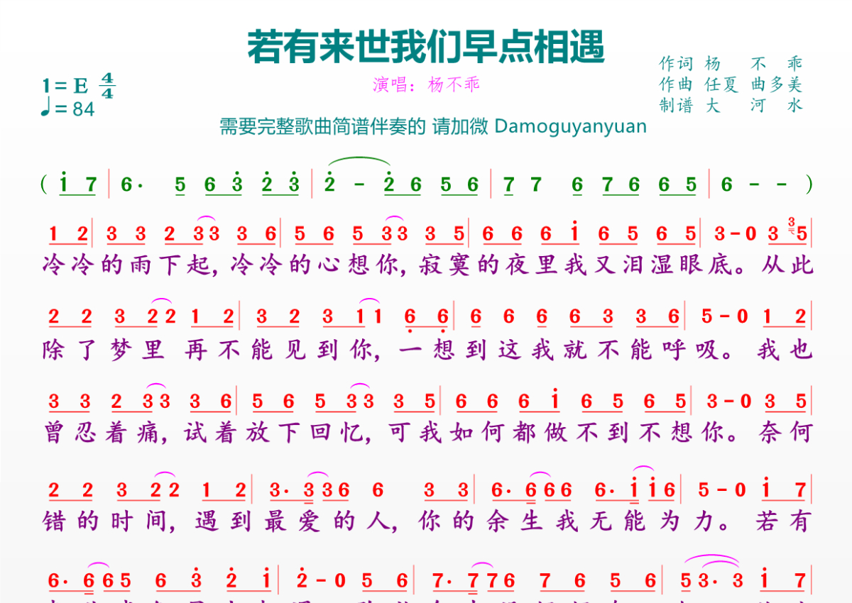 《若有来世我们早点相遇》是杨不乖演唱的一首歌曲,拍号为4/4拍,歌曲速度为每分钟84拍,这份简谱共有一张高清图谱,图谱由 @临海雪原 编配上传。