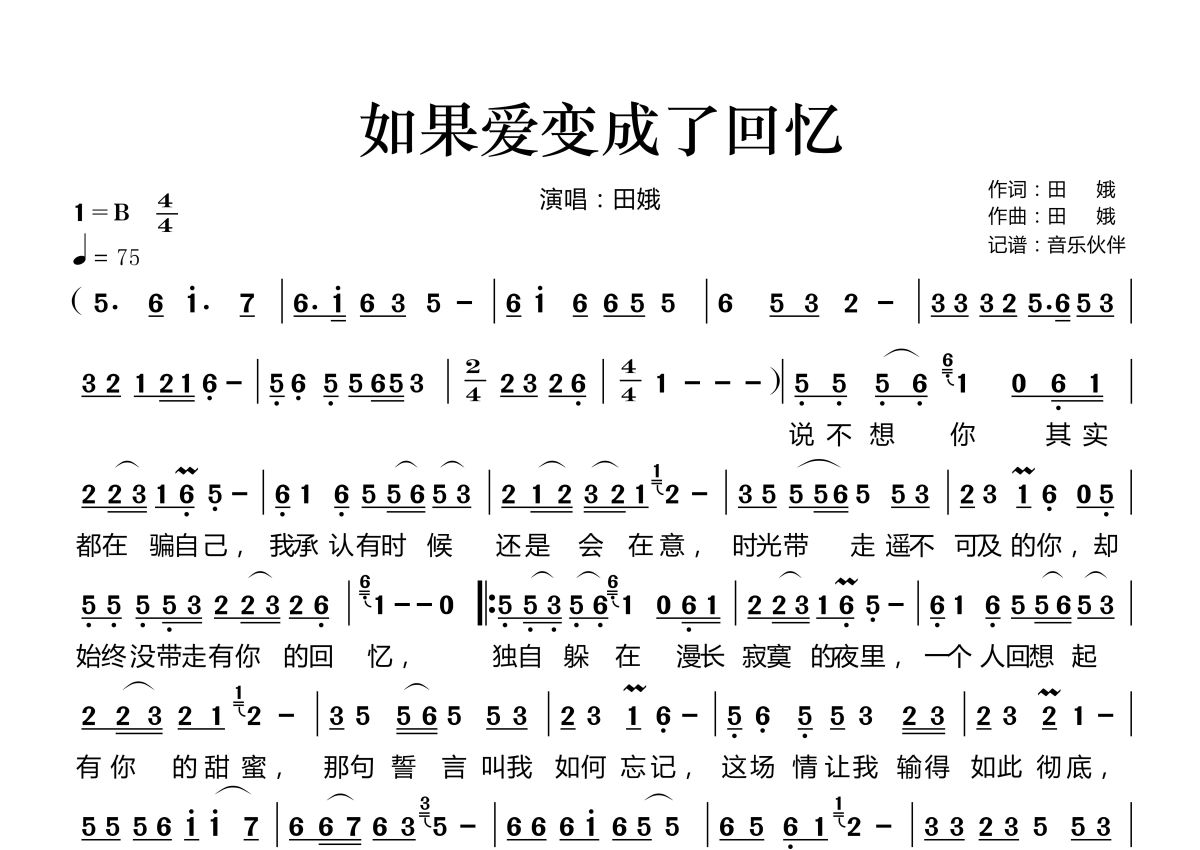 《如果爱变成了回忆》是田娥演唱的一首歌曲,拍号为4/4拍,歌曲速度为每分钟75拍,这份简谱共有一张高清图谱,图谱由 @音乐伙伴 编配上传。