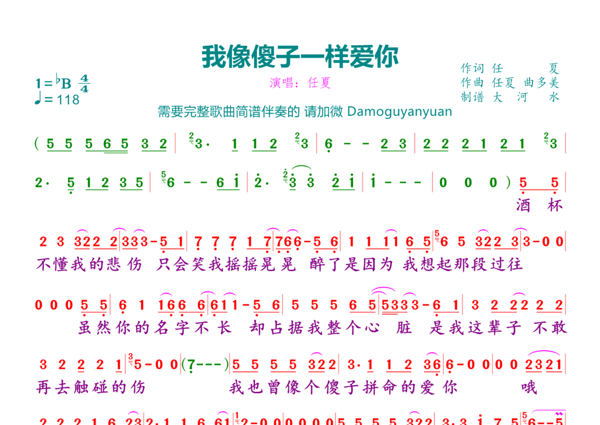 《我像傻子一样爱你》是任夏演唱的一首歌曲,拍号为4/4拍,歌曲速度为每分钟118拍,这份简谱共有两张高清图谱,图谱由 @临海雪原 编配上传。