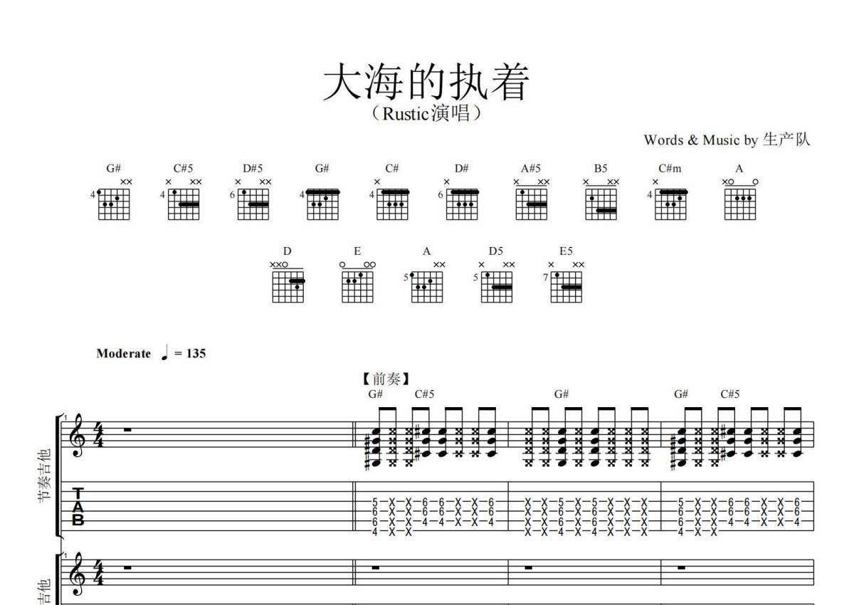 《大海的执着(乐队总谱)》是乐队总谱演唱的一首歌曲,原版总谱,拍号为4/4拍,歌曲速度为每分钟135拍,这份乐队总谱共有一张高清图谱,图谱由 @生产队 编配上传Rustic演唱的歌曲《大海的执着》原版总谱,含:主音吉他,节奏吉他,架子鼓,贝斯,主旋律共5编配,精编完美版,优质推荐!购买后,完整版请下载PDF或者联系客服获取!。