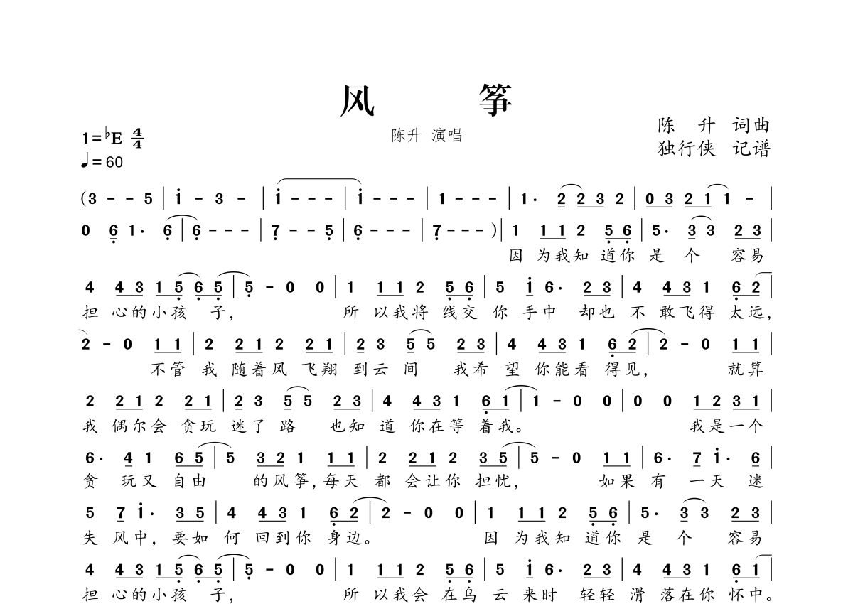 《风筝》是chen sheng演唱的一首歌曲,拍号为4/4拍,歌曲速度为每分钟60拍,这份简谱共有一张高清图谱,图谱由 @独行侠 编配上传。