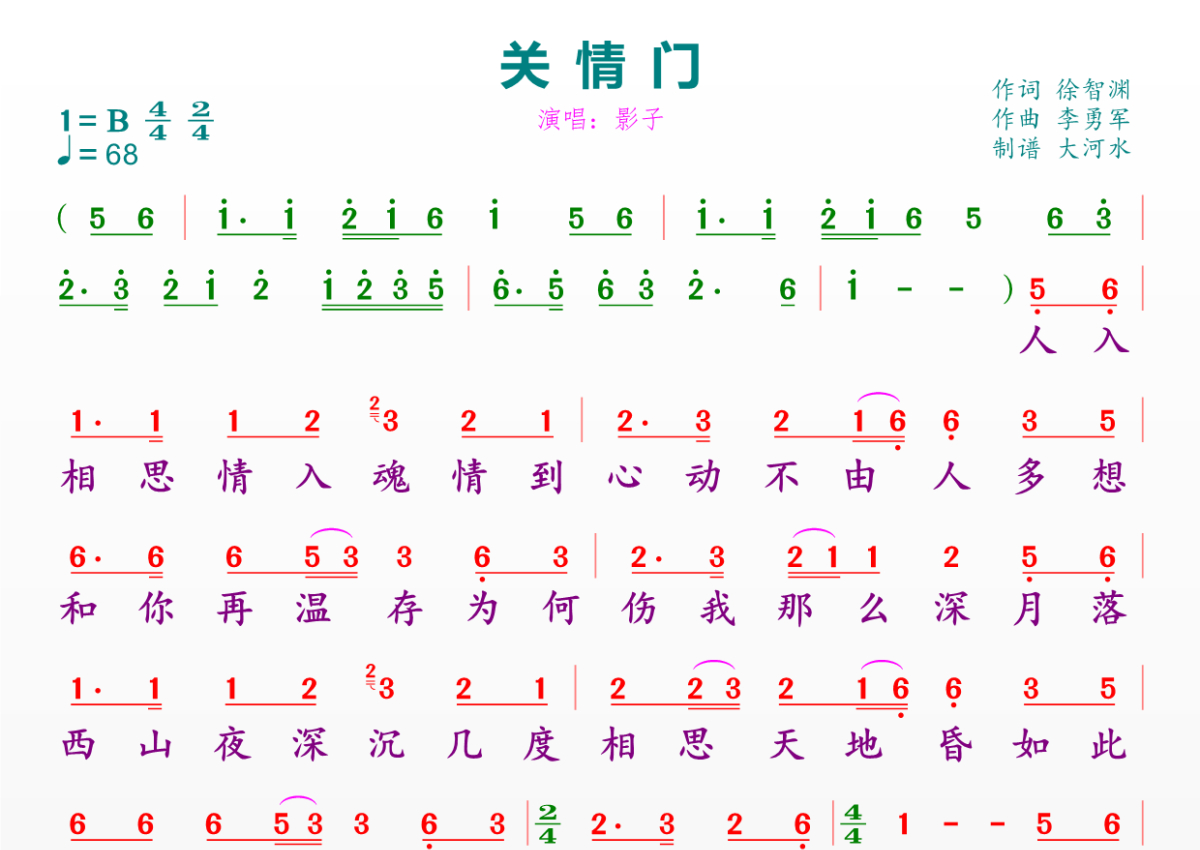 《关情门》是影子演唱的一首歌曲,拍号为4/4拍,歌曲速度为每分钟68拍,这份简谱共有一张高清图谱,图谱由 @临海雪原 编配上传。