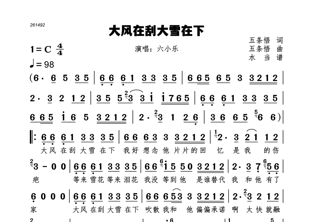 《大风在刮大雪在下》是六小乐演唱的一首歌曲,拍号为4/4拍,歌曲速度为每分钟98拍,这份简谱共有一张高清图谱,图谱由 @水当 编配上传。