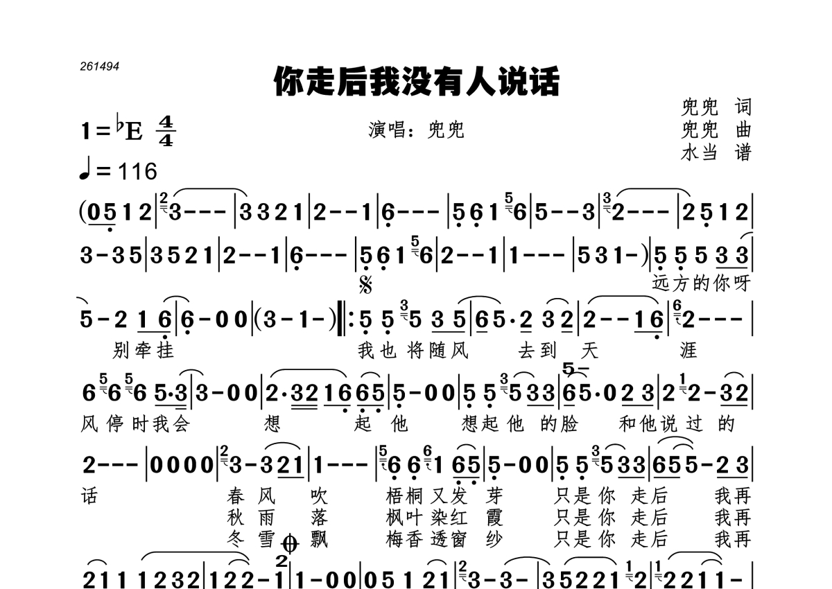 《你走后我没有人说话》是兜兜演唱的一首歌曲,歌曲速度为每分钟116拍,这份简谱共有一张高清图谱,图谱由 @水当 编配上传。