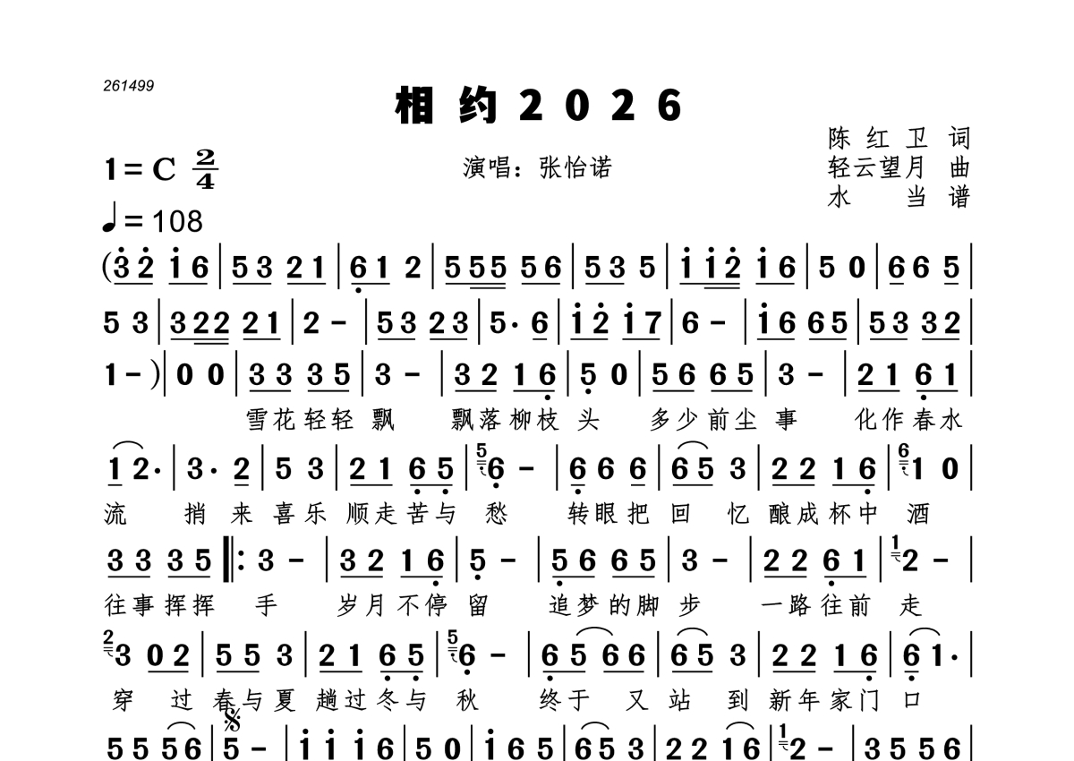 《相约2026》是张怡诺演唱的一首歌曲,拍号为4/4拍,歌曲速度为每分钟108拍,这份简谱共有一张高清图谱,图谱由 @水当 编配上传。