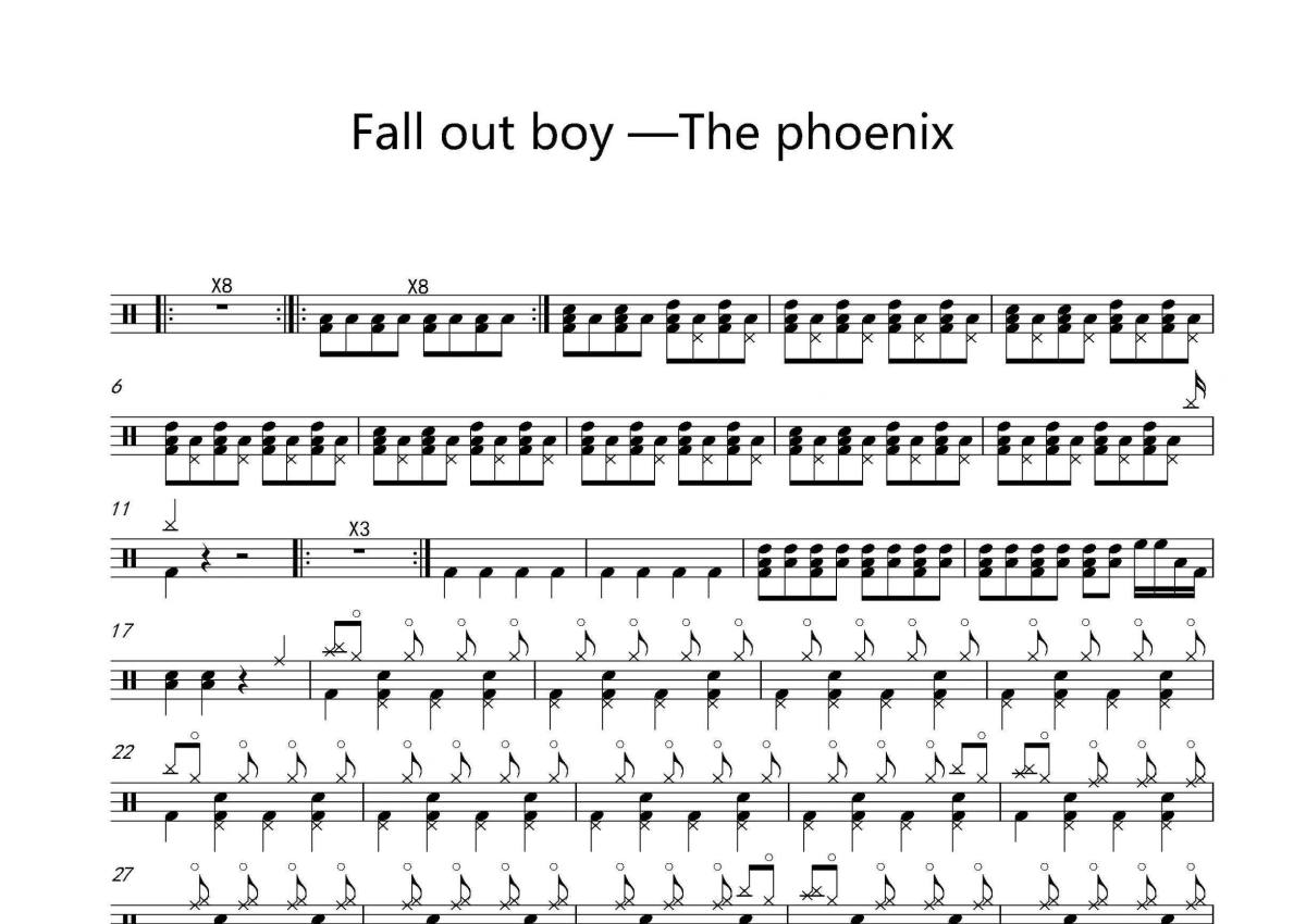《The phoenix》是Joey Wojcik Fall out boy演唱的一首歌曲,拍号为4/4拍,歌曲速度为每分钟138拍,这份架子鼓谱共有两张高清图谱,图谱由 @音符喷血者 编配上传,图谱使用五线谱编配,使用这份The phoenix架子鼓谱,你将能够轻松地敲打出这首Joey Wojcik Fall out boy的The phoenix,快来尝试吧。