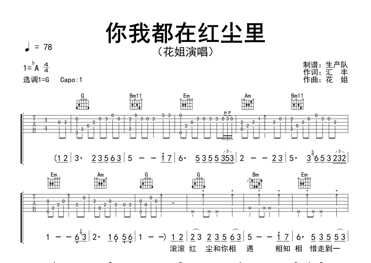 《你我都在红尘里》是花姐演唱的一首歌曲,精编完美版,拍号为4/4拍,歌曲速度为每分钟78拍,歌曲原调为Ab调,但由于原调指法比较难,为了方便弹奏,本吉他谱采用的是G调指法编配,变调夹1品弹奏即为原调,当然也可以根据自己的音域改变变调夹位置,或者通过改变和弦调性,以方便自己弹奏,这份吉他谱共有两张高清图谱,图谱由 @生产队 编配上传,图谱使用六线谱编配,包含吉他和弦指法、简谱以及歌词部分,使用这份你我都在红尘里吉他谱,可以让你更加方便地掌握这首歌曲的弹唱技巧,快来尝试吧。花姐演唱的歌曲《你我都在红尘里》原版吉他谱,含精准的前奏、间奏、尾奏solo编配,精编完美版,优质推荐!。