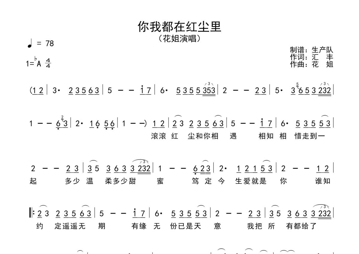 《你我都在红尘里》是花姐演唱的一首歌曲,原版简谱,拍号为4/4拍,歌曲速度为每分钟78拍,这份简谱共有一张高清图谱,图谱由 @生产队 编配上传花姐演唱的歌曲《你我都在红尘里》原版简谱,含精准的前奏、间奏、尾奏solo编配,精编完美版,优质推荐!。