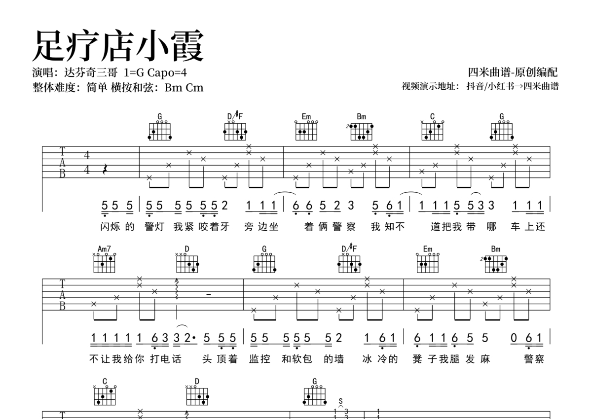 达芬奇三哥《足疗店小霞》吉他谱 - G调弹唱六线谱