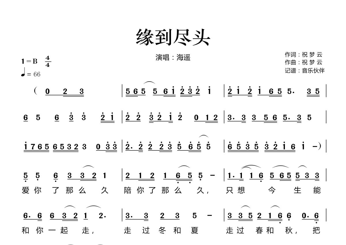 《缘到尽头》是海遥演唱的一首歌曲,拍号为4/4拍,歌曲速度为每分钟66拍,这份简谱共有两张高清图谱,图谱由 @音乐伙伴 编配上传。