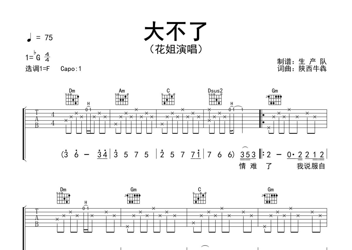 《大不了》是花姐演唱的一首歌曲,精编完美版,拍号为4/4拍,歌曲速度为每分钟75拍,歌曲原调为Gb调,但由于原调指法比较难,为了方便弹奏,本吉他谱采用的是F调指法编配,变调夹1品弹奏即为原调,当然也可以根据自己的音域改变变调夹位置,或者通过改变和弦调性,以方便自己弹奏,这份吉他谱共有两张高清图谱,图谱由 @生产队 编配上传,图谱使用六线谱编配,包含吉他和弦指法、简谱以及歌词部分,使用这份大不了吉他谱,可以让你更加方便地掌握这首歌曲的弹唱技巧,快来尝试吧。花姐演唱的歌曲《大不了》原版吉他谱,完整的前奏、间奏、尾奏编配,精编完美版,优质推荐!。