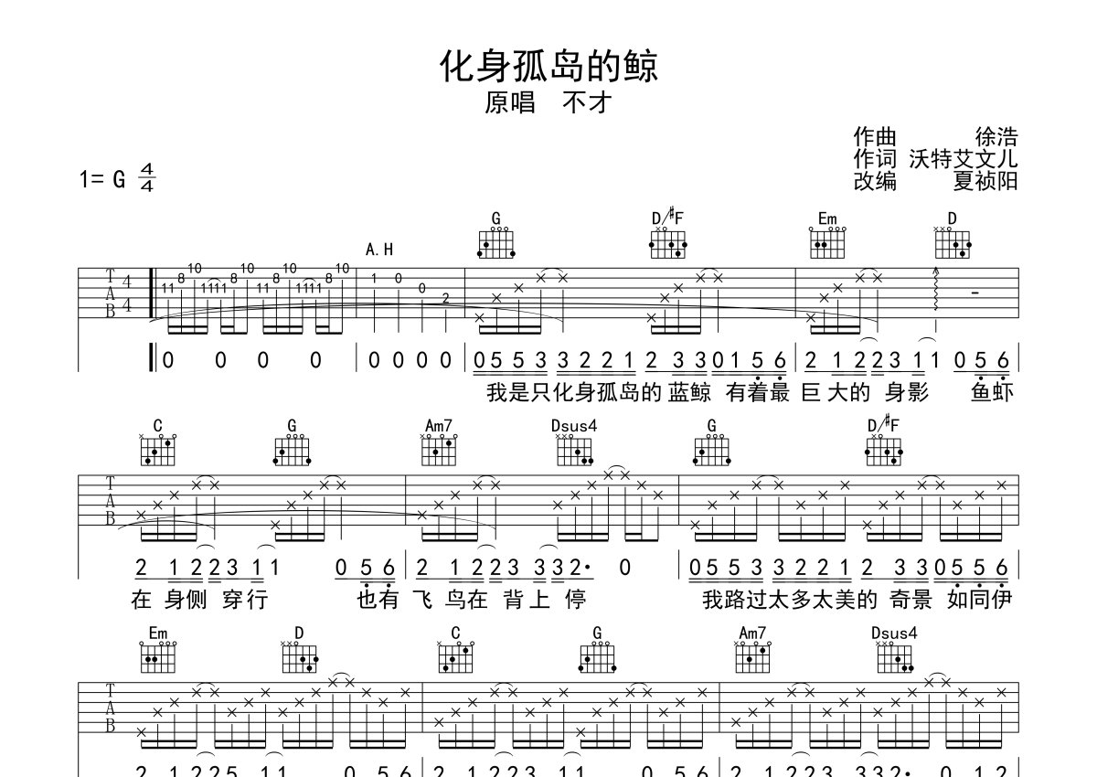 《化身孤岛的鲸》是不才演唱的一首歌曲,本吉他谱采用的是C调指法编配,这份吉他谱共有三张高清图谱,图谱由 @梦马音乐官方 编配上传,图谱使用六线谱编配,包含吉他和弦指法、简谱以及歌词部分,曲谱配备了相关的视频提供浏览,使用这份化身孤岛的鲸吉他谱,可以让你更加方便地掌握这首歌曲的弹唱技巧,快来尝试吧。不才《化身孤岛的鲸》吉他谱_C调吉他弹唱谱。