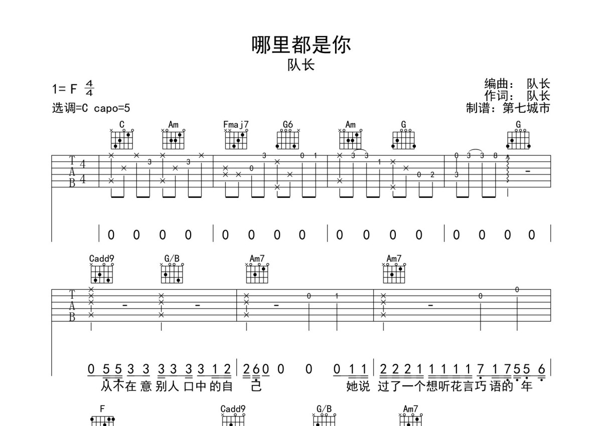 队长《哪里都是你》吉他谱 - C调弹唱六线谱