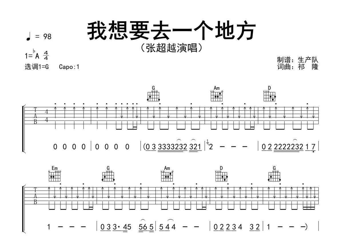 《我想要去一个地方》是张超越演唱的一首歌曲,精编完美版,拍号为4/4拍,歌曲速度为每分钟98拍,歌曲原调为Ab调,但由于原调指法比较难,为了方便弹奏,本吉他谱采用的是G调指法编配,变调夹1品弹奏即为原调,当然也可以根据自己的音域改变变调夹位置,或者通过改变和弦调性,以方便自己弹奏,这份吉他谱共有三张高清图谱,图谱由 @生产队 编配上传,图谱使用六线谱编配,包含吉他和弦指法、简谱以及歌词部分,使用这份我想要去一个地方吉他谱,可以让你更加方便地掌握这首歌曲的弹唱技巧,快来尝试吧。张超越演唱的歌曲《我想要去一个地方》原版吉他谱,含精准的前奏、间奏solo编配,精编完美版,优质推荐!。