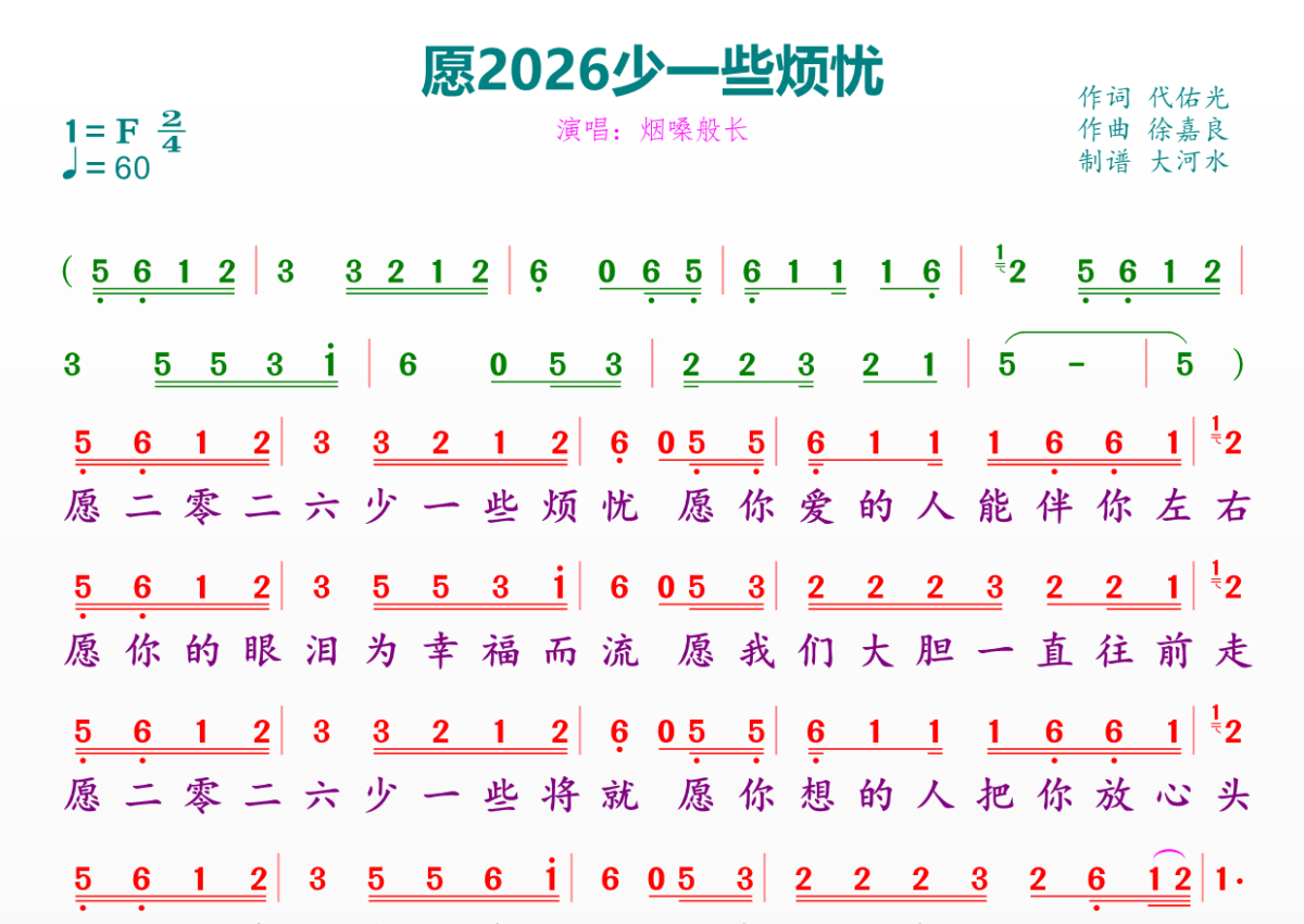 《愿2026少一些烦忧》是烟嗓船长演唱的一首歌曲,拍号为2/4拍,歌曲速度为每分钟60拍,这份简谱共有一张高清图谱,图谱由 @临海雪原 编配上传。