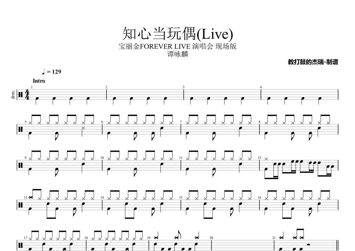 《知心当玩偶(Live)》是谭咏麟演唱的一首歌曲,宝丽金FOREVER LIVE 演唱会 现场版,拍号为4/4拍,歌曲速度为每分钟129拍,这份架子鼓谱共有三张高清图谱,图谱由 @Jerry 编配上传,图谱使用五线谱编配,使用这份知心当玩偶(Live)架子鼓谱,你将能够轻松地敲打出这首谭咏麟的知心当玩偶(Live),快来尝试吧。