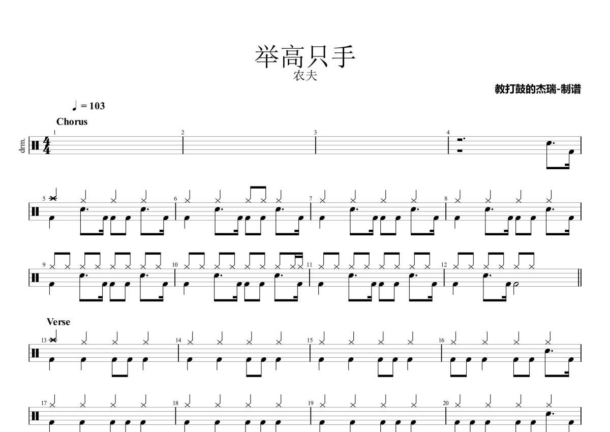 《举高只手》是农夫演唱的一首歌曲,拍号为4/4拍,歌曲速度为每分钟103拍,这份架子鼓谱共有两张高清图谱,图谱由 @Jerry 编配上传,图谱使用五线谱编配,使用这份举高只手架子鼓谱,你将能够轻松地敲打出这首农夫的举高只手,快来尝试吧。