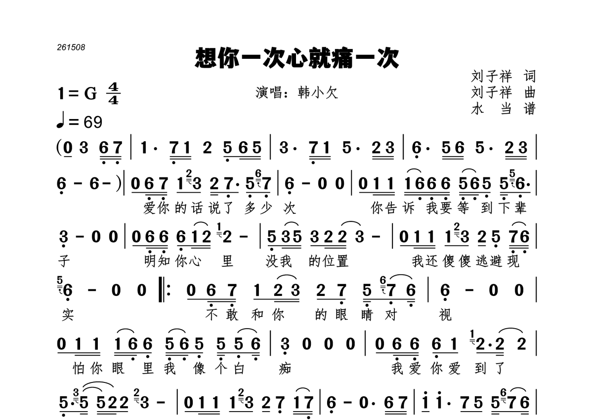 想你一次心就痛一次简谱 - 韩小欠演唱