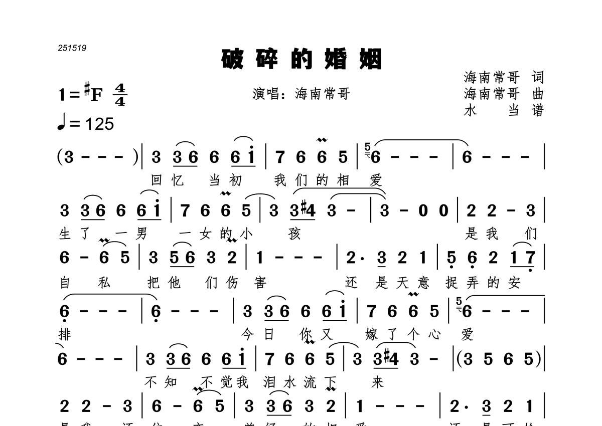 《破碎的婚姻》是海南常哥演唱的一首歌曲,拍号为4/4拍,歌曲速度为每分钟125拍,这份简谱共有一张高清图谱,图谱由 @水当 编配上传。