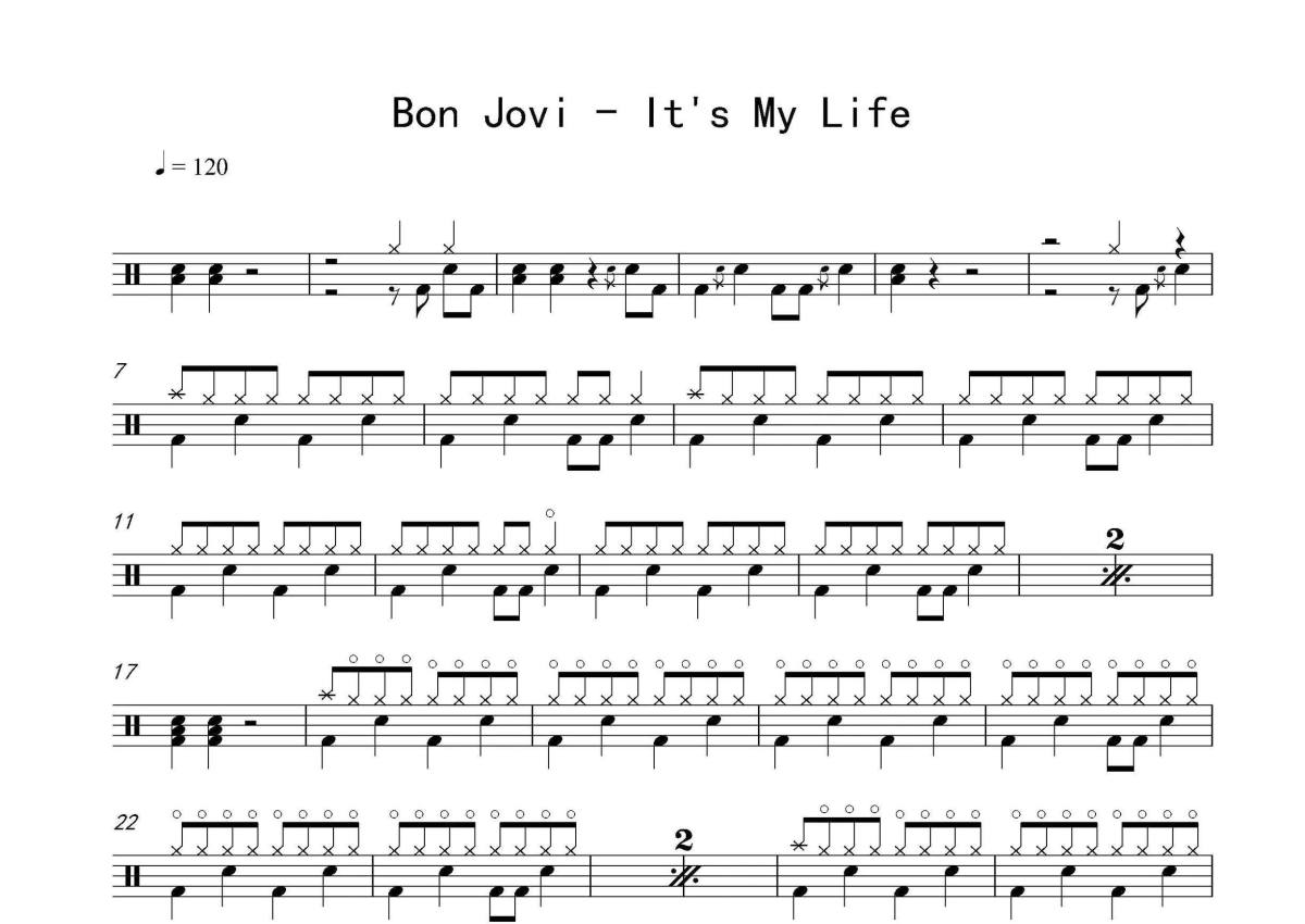 《It's My Life》是Bon Jovi演唱的一首歌曲,拍号为4/4拍,歌曲速度为每分钟120拍,这份架子鼓谱共有两张高清图谱,图谱由 @音符喷血者 编配上传,图谱使用五线谱编配,使用这份It's My Life架子鼓谱,你将能够轻松地敲打出这首Bon Jovi的It's My Life,快来尝试吧。