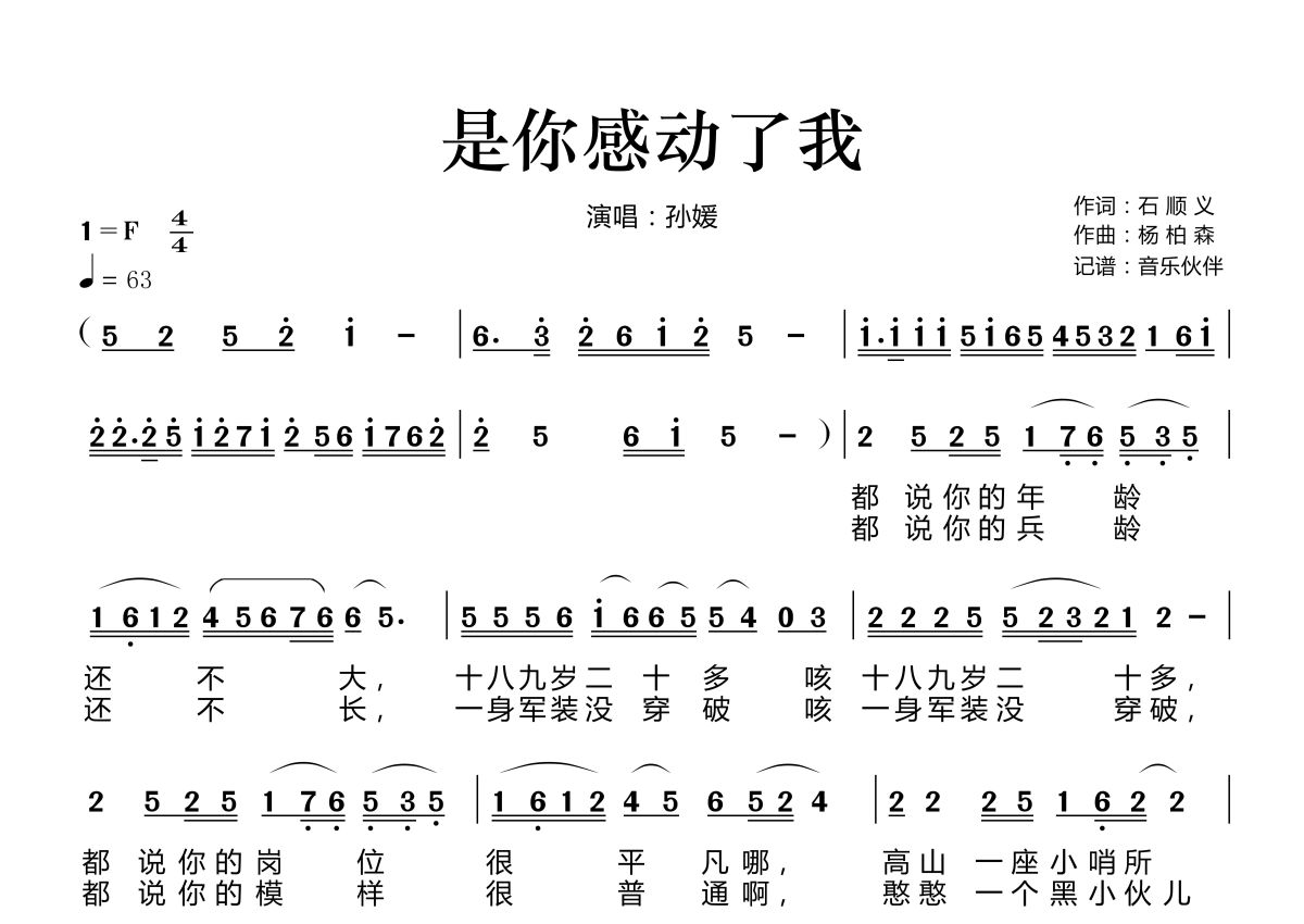 《是你感动了我》是孙媛演唱的一首歌曲,拍号为4/4拍,歌曲速度为每分钟63拍,这份简谱共有两张高清图谱,图谱由 @音乐伙伴 编配上传。