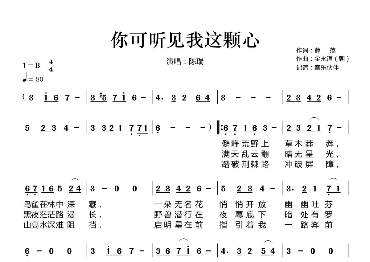 《你可听见我这颗心》是陈瑞演唱的一首歌曲,拍号为4/4拍,歌曲速度为每分钟80拍,这份简谱共有一张高清图谱,图谱由 @音乐伙伴 编配上传。