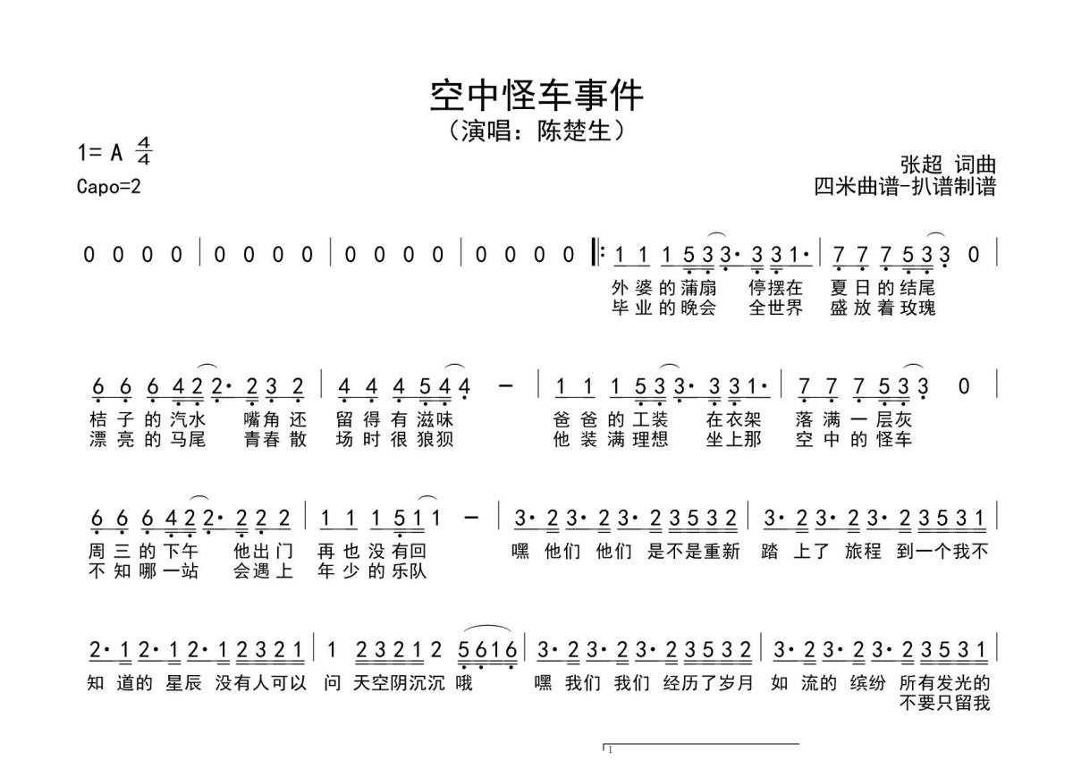 《空中怪车事件》是陈楚生演唱的一首歌曲,拍号为4/4拍,这份简谱共有一张高清图谱,图谱由 @SRV7758521 编配上传。