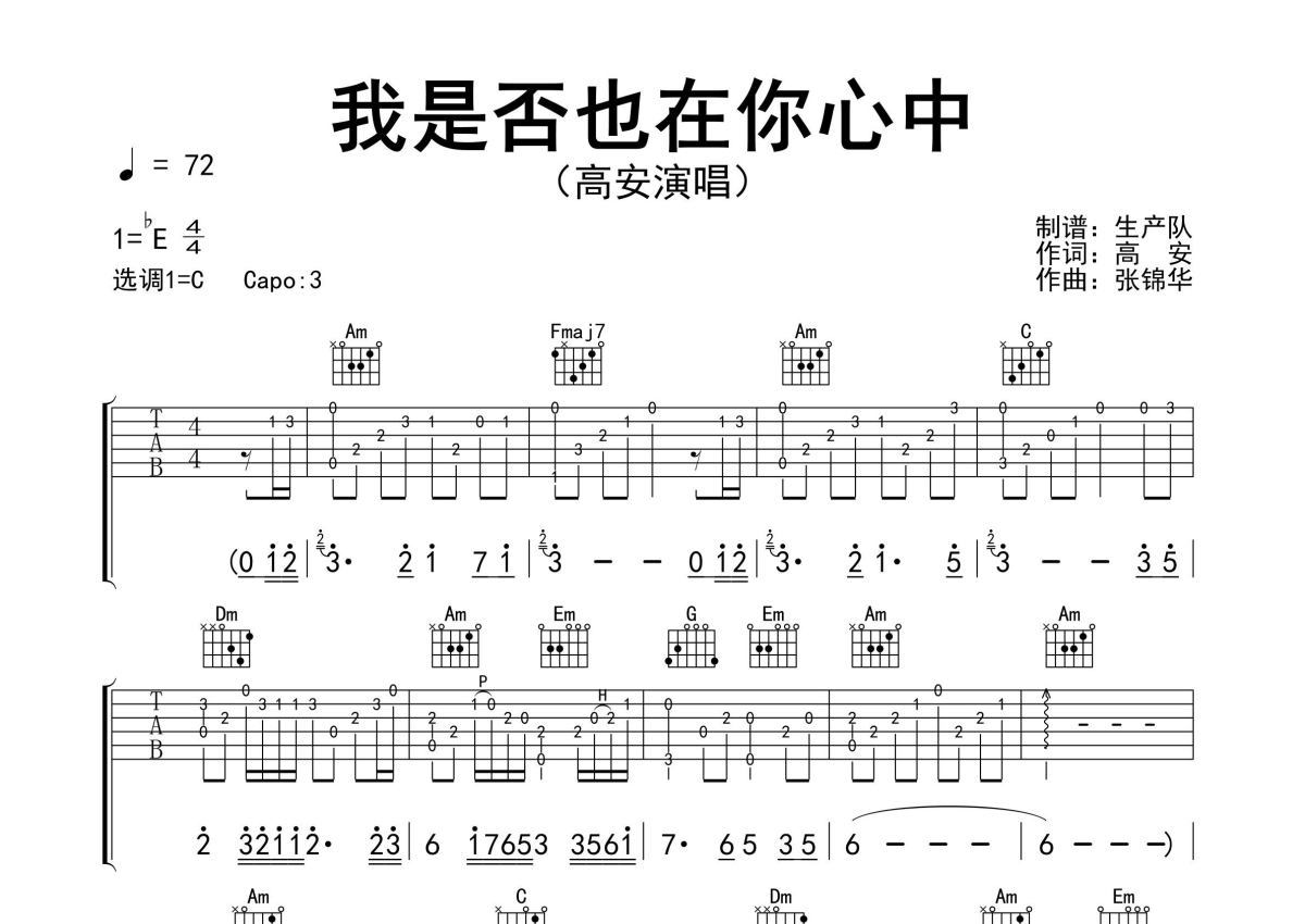 《我是否也在你心中》是高安演唱的一首歌曲,精编完美版,拍号为4/4拍,歌曲速度为每分钟72拍,歌曲原调为Eb调,但由于原调指法比较难,为了方便弹奏,本吉他谱采用的是C调指法编配,变调夹3品弹奏即为原调,当然也可以根据自己的音域改变变调夹位置,或者通过改变和弦调性,以方便自己弹奏,这份吉他谱共有两张高清图谱,图谱由 @生产队 编配上传,图谱使用六线谱编配,包含吉他和弦指法、简谱以及歌词部分,使用这份我是否也在你心中吉他谱,可以让你更加方便地掌握这首歌曲的弹唱技巧,快来尝试吧。高安演唱的歌曲《我是否也在你心中》原版吉他谱,含精准的前奏、间奏solo编配,精编完美版,优质推荐!。