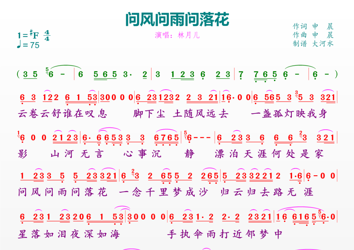 《问风问雨问落花》是林月儿演唱的一首歌曲,拍号为4/4拍,歌曲速度为每分钟75拍,这份简谱共有一张高清图谱,图谱由 @临海雪原 编配上传。