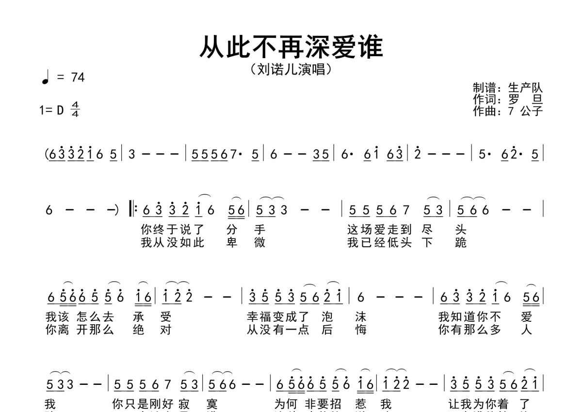 《从此不再深爱谁》是刘诺儿演唱的一首歌曲,原版简谱,拍号为4/4拍,歌曲速度为每分钟74拍,这份简谱共有一张高清图谱,图谱由 @生产队 编配上传刘诺儿演唱的歌曲《从此不再深爱谁》原版简谱,含精准的前奏、间奏、尾奏solo编配,精编完美版,优质推荐!。