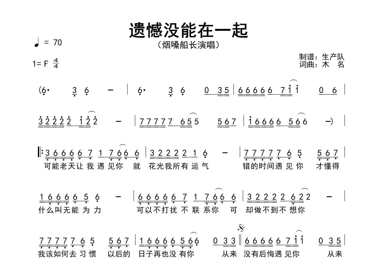 《遗憾没能在一起》是烟嗓船长演唱的一首歌曲,原版简谱,拍号为4/4拍,歌曲速度为每分钟70拍,这份简谱共有一张高清图谱,图谱由 @生产队 编配上传烟嗓船长演唱的歌曲《遗憾没能在一起》原版简谱,含精准的前奏、间奏、尾奏solo编配,精编完美版,优质推荐!。