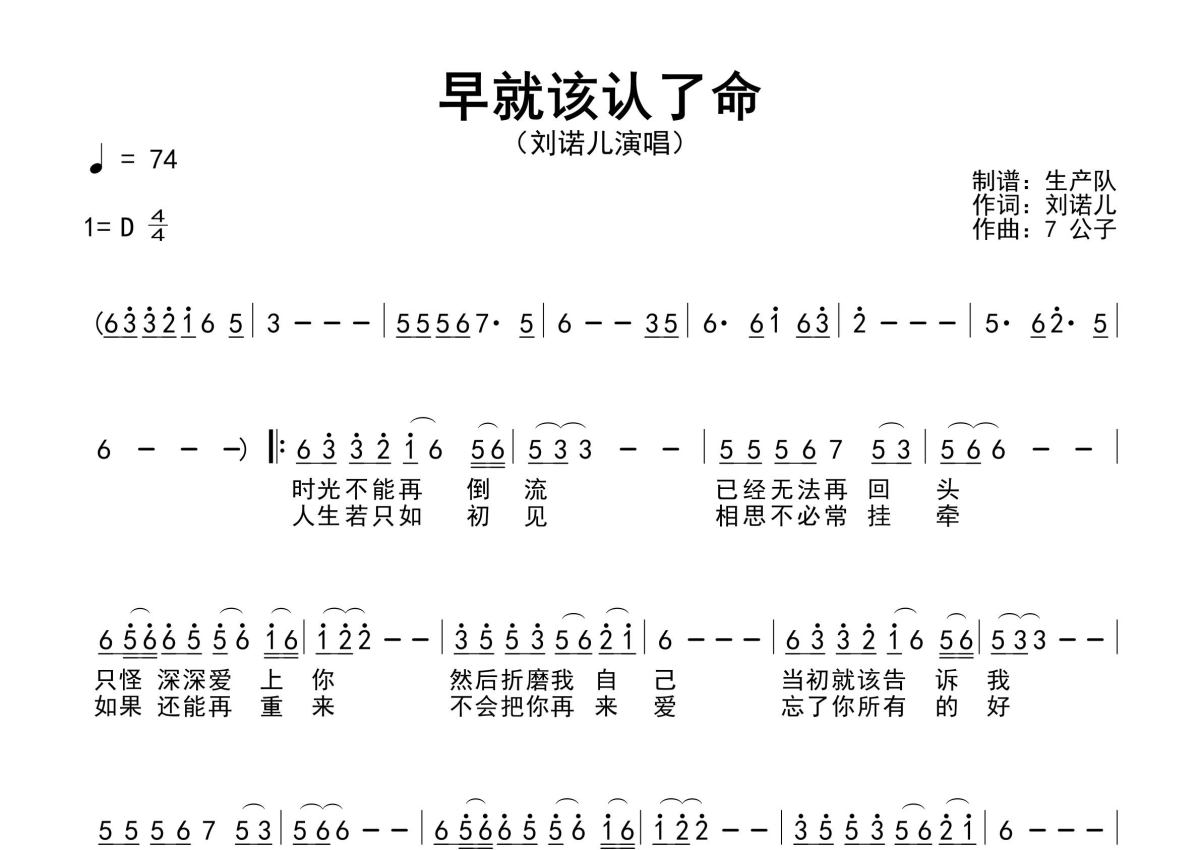 《早就该认了命》是刘诺儿演唱的一首歌曲,原版简谱,拍号为4/4拍,歌曲速度为每分钟74拍,这份简谱共有一张高清图谱,图谱由 @生产队 编配上传刘诺儿演唱的歌曲《早就该认了命》原版简谱,含精准的前奏、间奏、尾奏solo编配,精编完美版,优质推荐!。