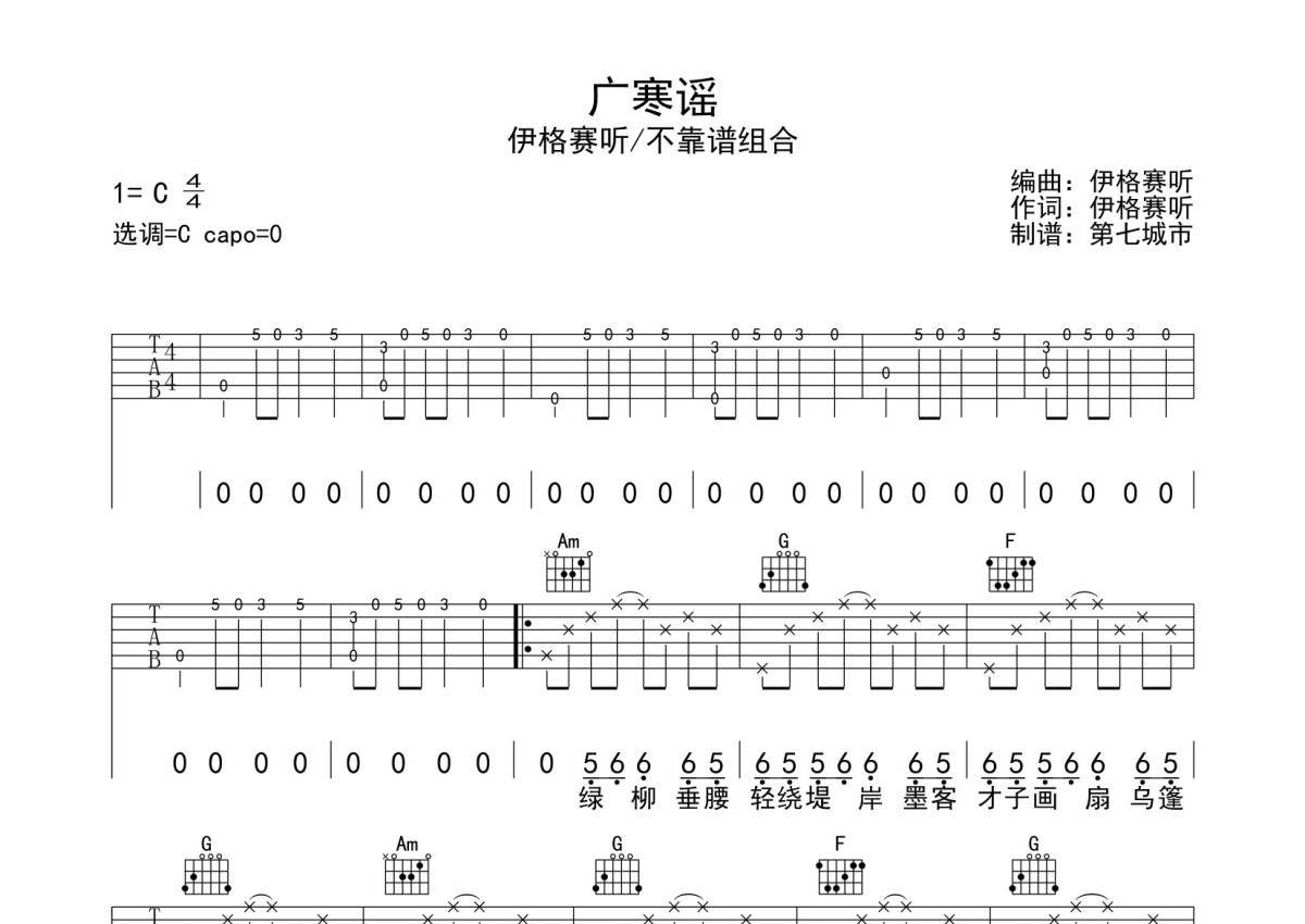 伊格赛听 / 不靠谱组合《广寒瑶》吉他谱 - C调弹唱六线谱