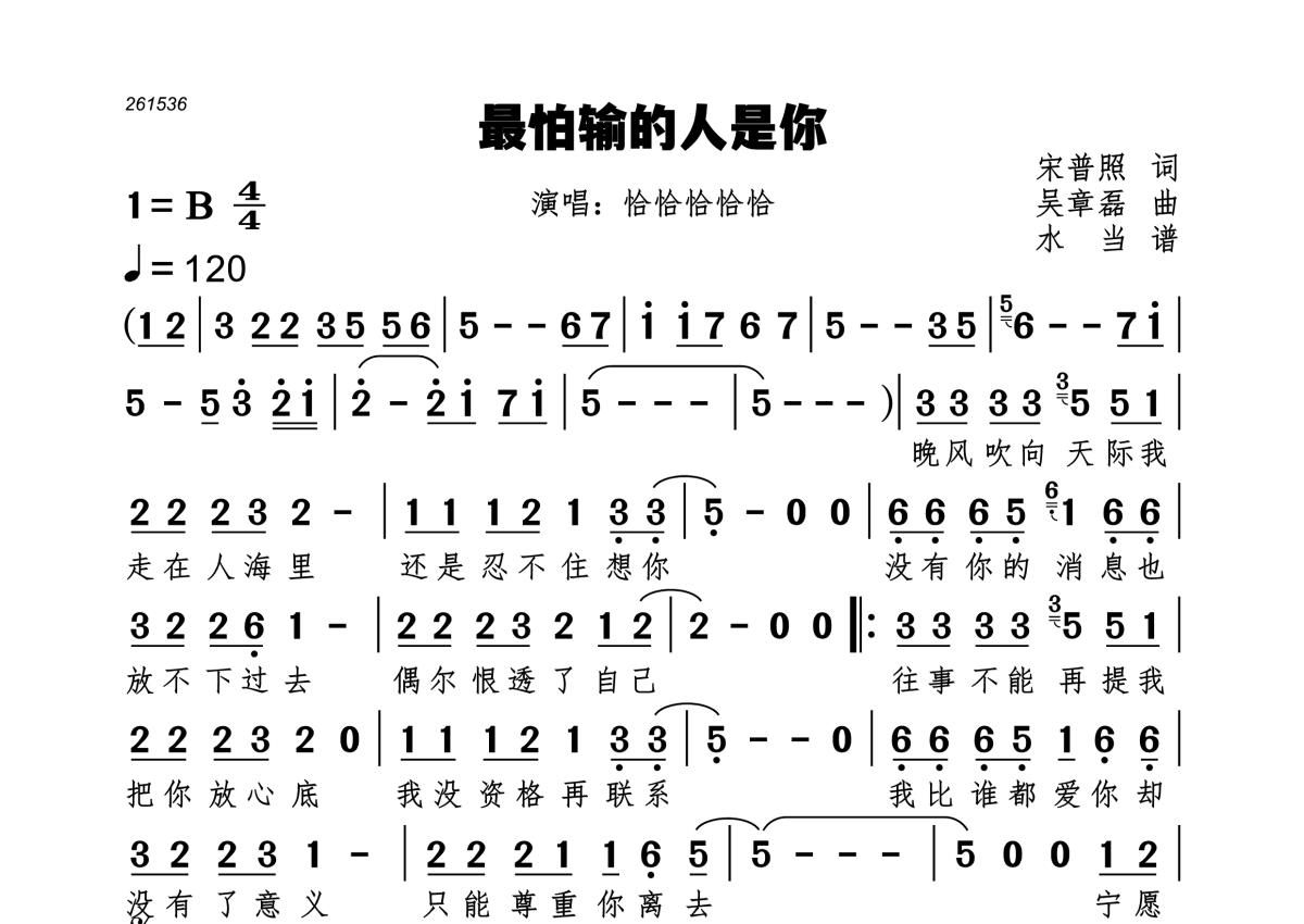 《最怕输的人是你》是恰恰恰恰恰演唱的一首歌曲,拍号为4/4拍,歌曲速度为每分钟120拍,这份简谱共有一张高清图谱,图谱由 @水当 编配上传。