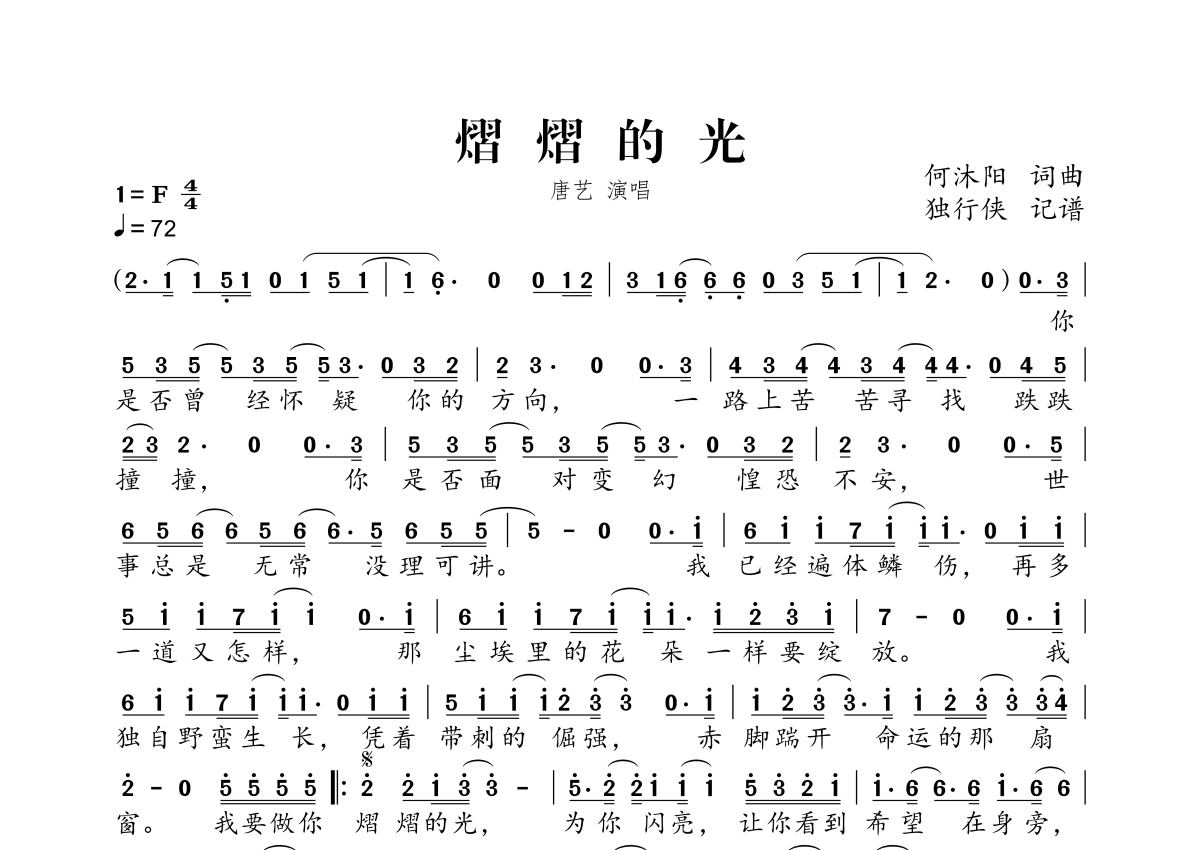 《熠熠的光》是唐艺演唱的一首歌曲,拍号为4/4拍,歌曲速度为每分钟72拍,这份简谱共有一张高清图谱,图谱由 @独行侠 编配上传。